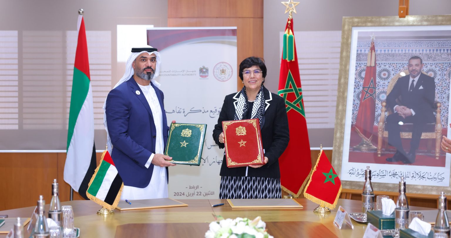 On Monday, April 22, 2024, Mr. Humaid Obaid Khalifa Obaid Abu Shabas, President of the UAE Accountability Authority, and Ms. Zineb El Adaoui, First President of the Court of Accounts, signed a memorandum of understanding to strengthen bilateral cooperation. This reflects the shared desire of both parties to consolidate and promote relations of friendship and cooperation, in line with the deep historical ties that unite the two brotherly countries.