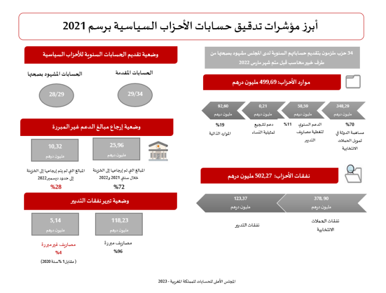 La Cour des comptes a rendu public un rapport, relatif à l’audit des comptes des partis politiques et la vérification de la sincérité de leurs dépenses au titre du soutien accordé par l’État en 2021 pour la contribution à la couverture de leurs frais de gestion ; et ce conformément aux dispositions de la loi organique n°29.11 relative aux partis politiques et de la loi n°62.99 formant code des juridictions financières.